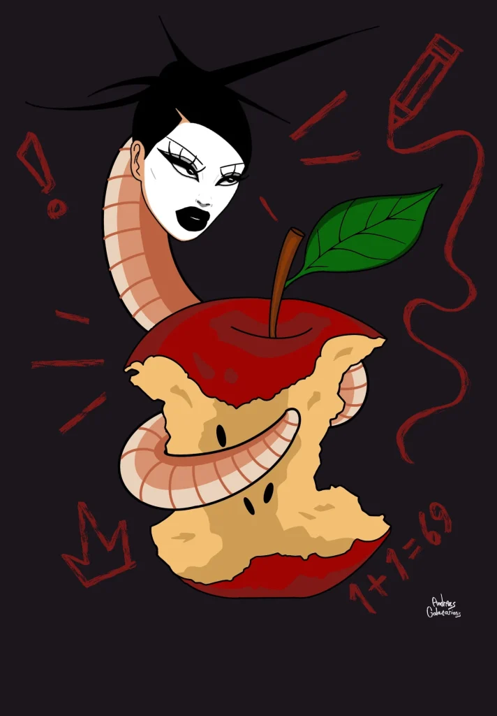 The female figure, both powerful and surreal, emerges from the apple, a symbol layered with multiple meanings. The apple and the worm reference the biblical narrative of Adam and Eve, evoking themes of temptation, curiosity, and the moment of awakening. At the same time, the apple recalls the familiar object placed on a teacher’s desk, introducing ideas of learning, growth, and the transition from innocence to knowledge.